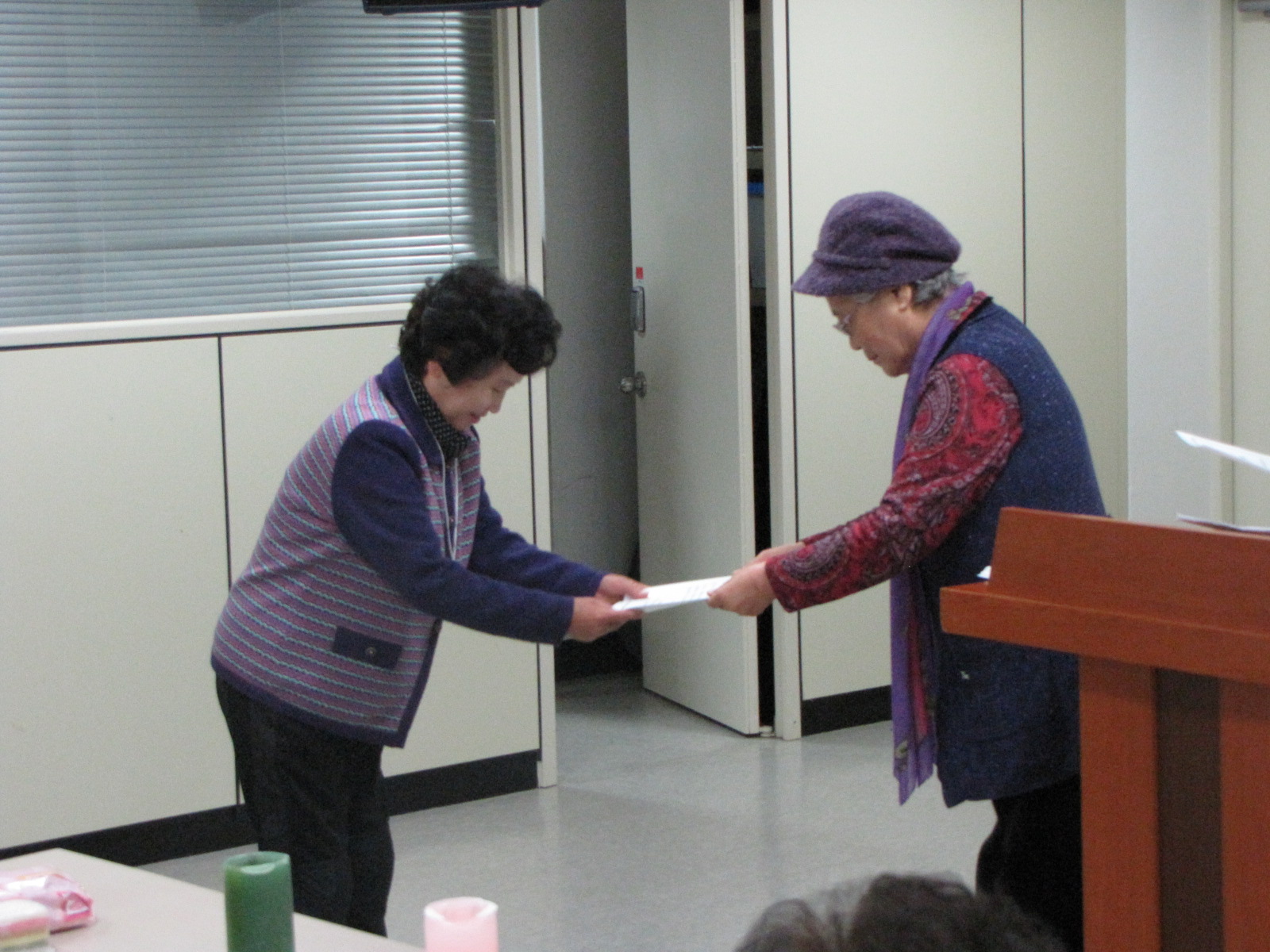 2010년 실버아카데미 수료증을 주시는 한진수 사모님.